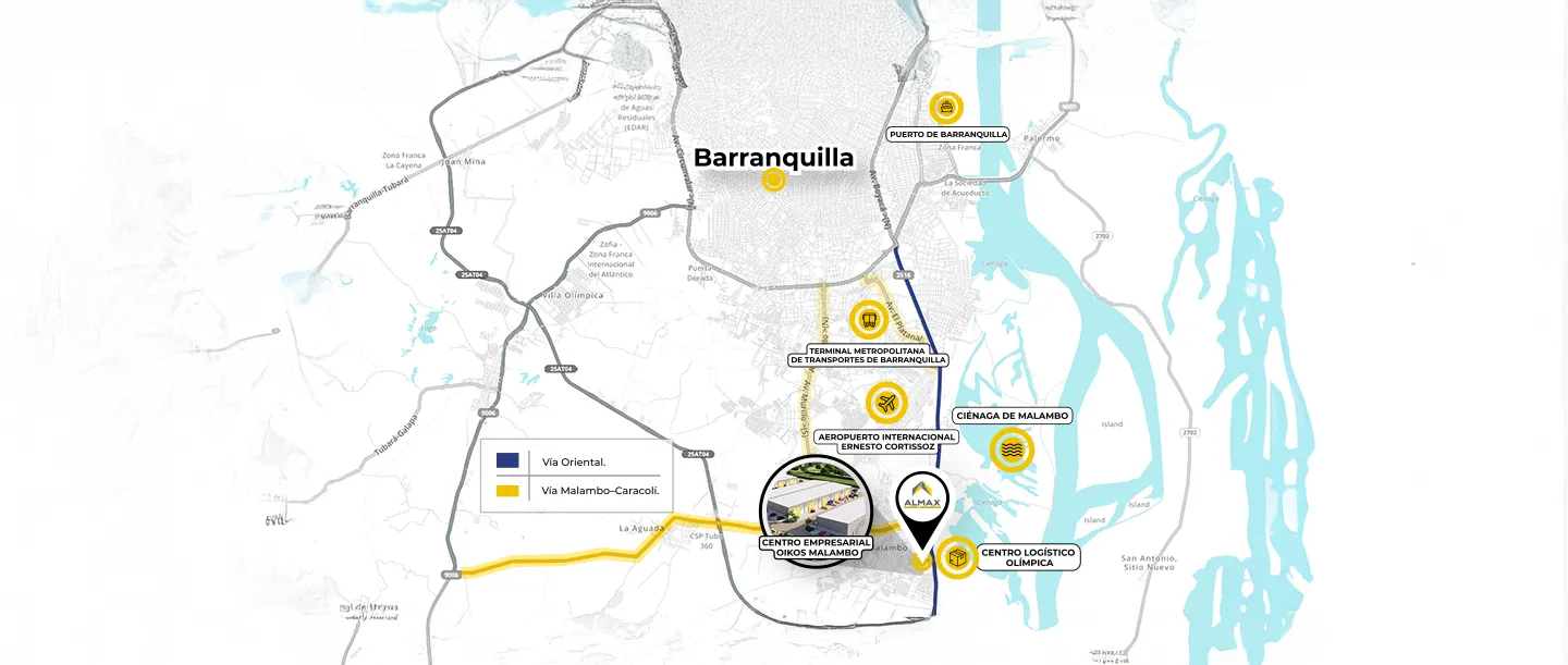 ALMAX MALAMBO Ubicado en el corazón del corredor vial del Caribe, a pocos minutos de Barranquilla, el aeropuerto y uno de los principales puertos del país, garantiza conectividad, eficiencia y disponibilidad inmediata para grandes movimientos industriales y comerciales.